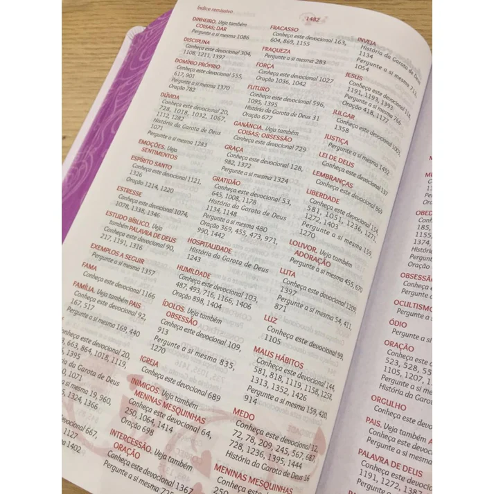 Ajuda rápida, um índice com versículos bem legais sobre temas e situações que você enfrenta todos os dias. A Bíblia da garota cristã foi feita do seu jeito para você se tornar a garota que Deus a criou para ser.