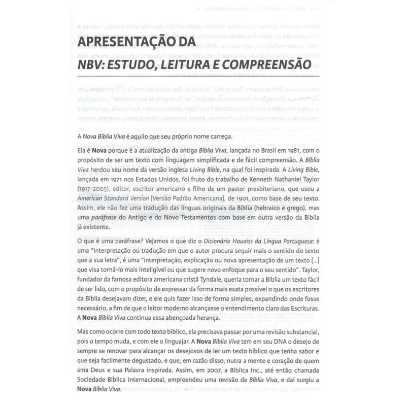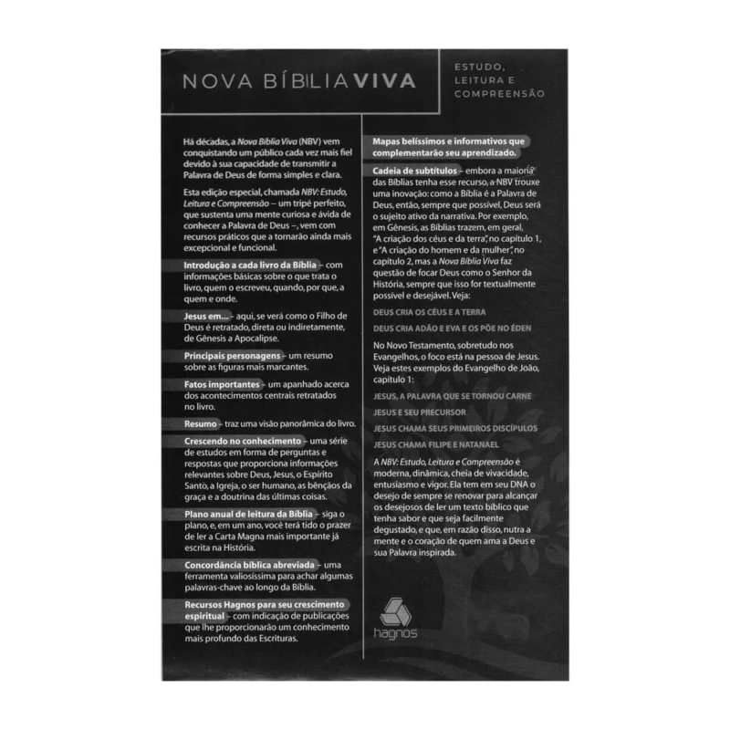 A Nova Bíblia Viva (NBV) – Estudo, Leitura e Compreensão é moderna, dinâmica, cheia de vivacidade, entusiasmo e vigor. Ela tem em seu DNA o desejo de sempre se renovar para alcançar os desejosos de ler um texto bíblico que tenha sabor e que seja facilmente degustado, e que, em razão disso, nutra a mente e o coração de quem ama a Deus e sua Palavra inspirada.