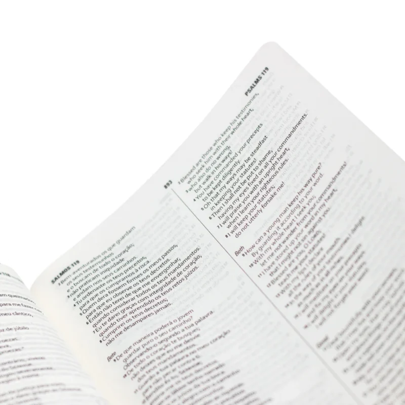 Esta edição da Bíblia Sagrada oferece o texto bíblico em duas línguas: inglês e português. Na publicação, as traduções Nova Almeida Atualizada (NAA) e English Standard Version (ESV), foram dispostas em duas colunas, permitindo que o leitor compare lado a lado o texto bíblico nas duas línguas. A English Standard Version (ESV) é uma das mais consagradas traduções da língua inglesa, tendo como base a tradicional King James Version (KJV). De maneira muito similar ao que foi feito com a Almeida Revista e Atualizada (ARA) e que resultou na Nova Almeida Atualizada (NAA), o texto da KJV foi trabalhado meticulosamente, à luz das línguas originais, por especialistas. O resultado é uma tradução bíblica literal, que ainda conserva o padrão clássico da KJV, mas com um vocabulário mais acessível ao leitor de hoje. A ESV é uma das traduções bíblicas mais populares nos Estados Unidos e em todo o mundo de fala inglesa.