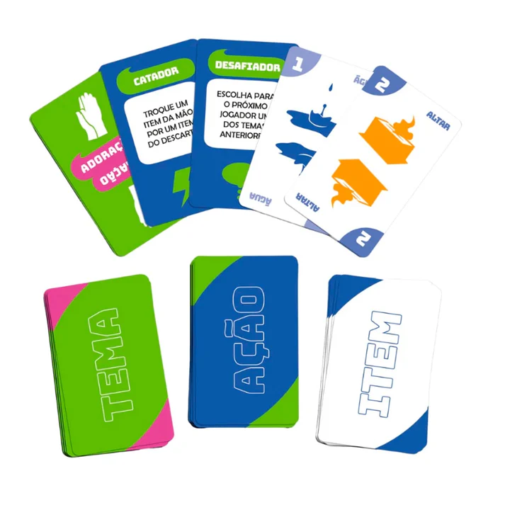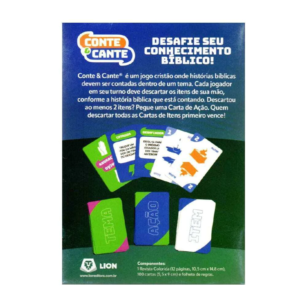E caso não consiga contá-la, o jogador pode optar por cantar uma música com a palavra do respectivo tema. Ganha o jogo quem descartar todas as cartas ITEM primeiro, usando-as para contar alguma história das Escritura ou cantando uma canção. Divertido e interativo, “Conte e Cante” é perfeito para jogar com os amigos!
