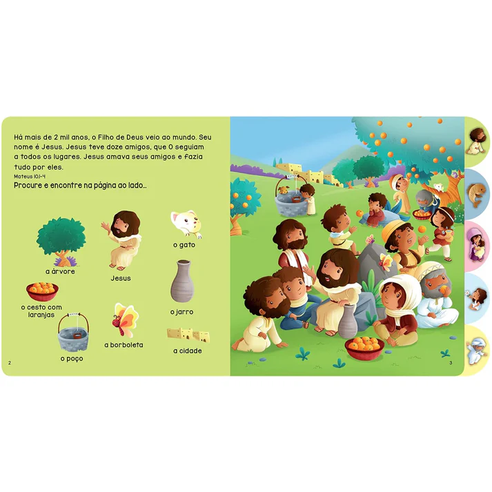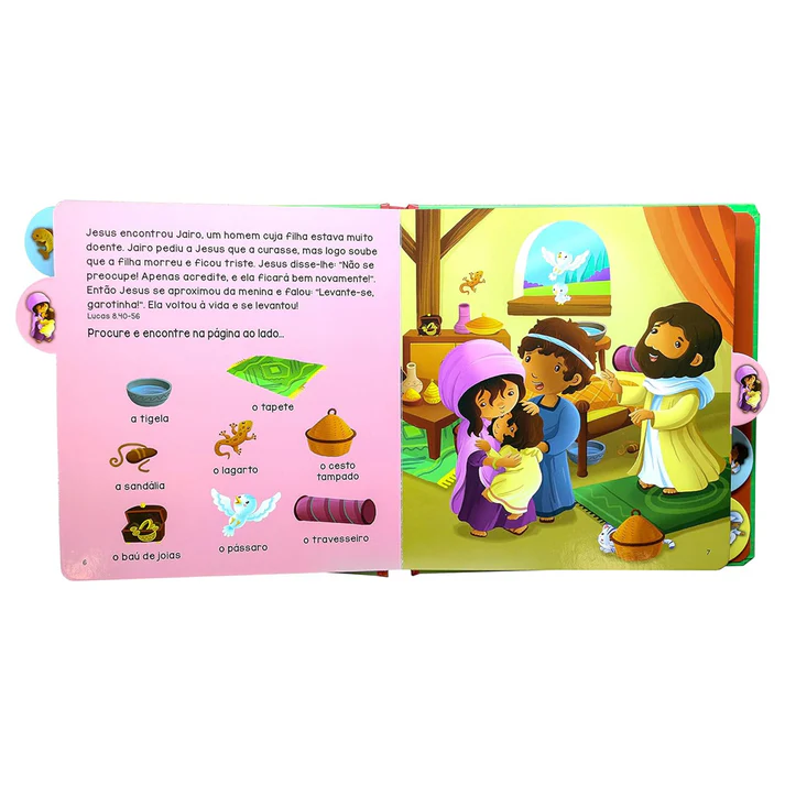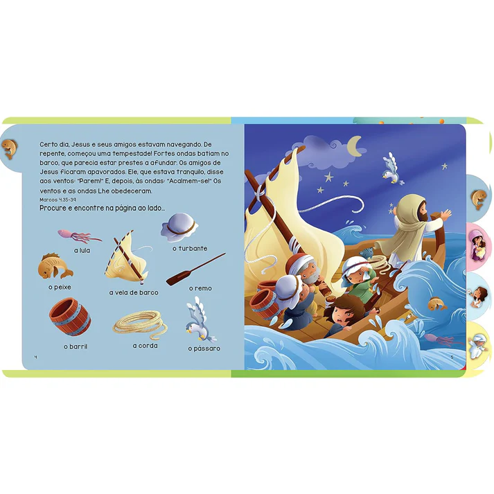 O livro apresenta as passagens bíblicas com uma linguagem infantil e de fácil compeensão, estimulando a interação da criança com elementos que devem ser encontrados em cada ilustração.